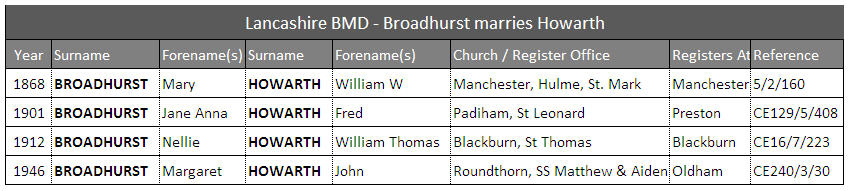 It’s not uncommon for families to marry into other families more than once. Is this four times? The Nellie Broadhurst listed in the chart is one of “The Eleven” and I wonder if “Jane Anna” is her older sister. Nellie was 12 years younger than Jane Ann, “Annie” as she was refered to. The wedding locations would also make geographical sense. Any thoughts out there? Does anyone have the other two couples in their family trees?