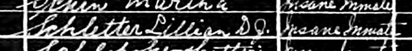 While researching your family tree have you found any “forgotten” relatives tucked away in insane asylums? I found one. My maternal Great Aunt, Lillian Schletter. According to family lore, Lillian “went after her brother with a kitchen knife.” And that’s the end of the details. Her brother, my maternal Grandfather George Schletter, did visit her after her incarceration. But certainly nothing was spoken of Lillian, at least not to any of the younger family. And now anyone with any possible first hand memories of her are gone. Sometime between 1915 and 1920, Lillian D. Schletter was committed to what was at times the largest psychiatric hospital in the United States, Kings Park Psychiatric Center, in Kings Park, New York. The “Insane Inmate” census entry shown below is from the 1920 US Census. By the 1930 US Census, Lillian resided at the Creedmoor location of the Brooklyn State Hospital. She is also listed at Creedmoor in the 1940 Census.