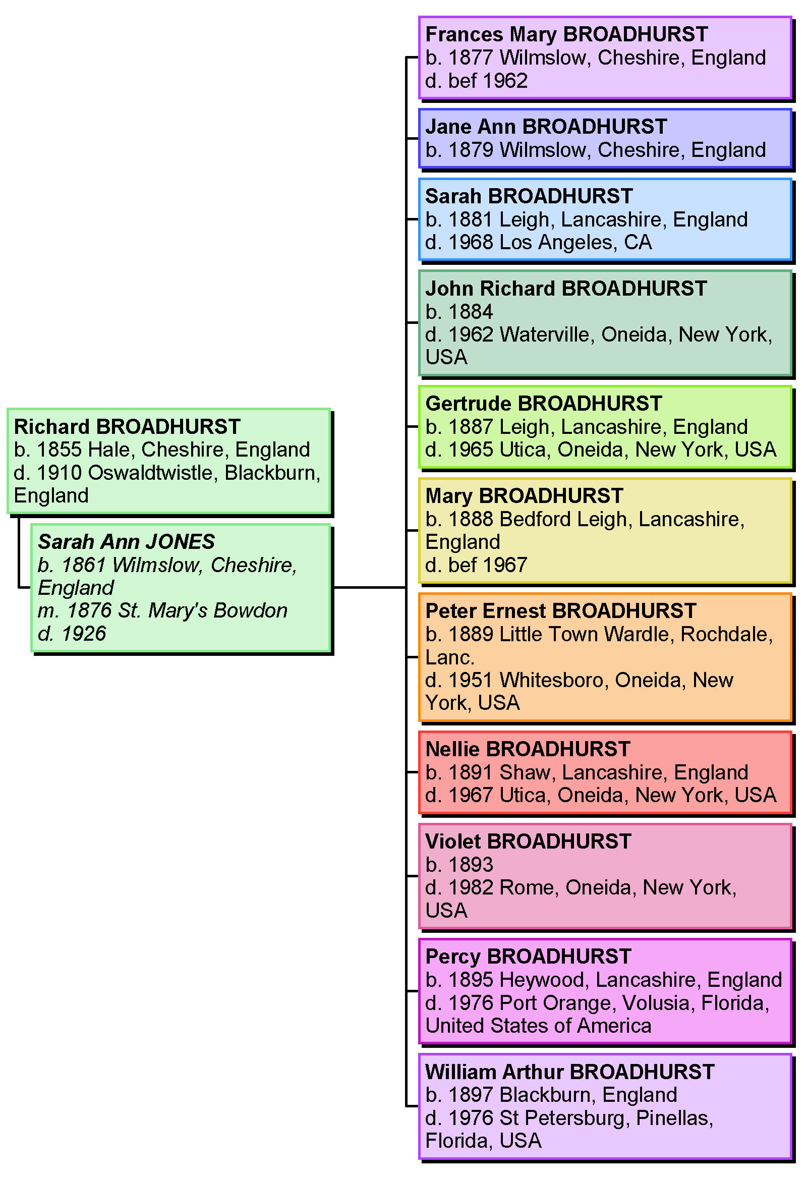 While visiting cousin Kay we ran across this photo of what looks to be a family grouping of … Broadhursts? I’m just guessing here but I think it may be some portion of “The Eleven” from which many of us are descended. The boys in the back certainly look like brothers and they bear a close resemblance to our grandfather Peter Ernest, number 7 of the 11. Click on the photo for a larger view.