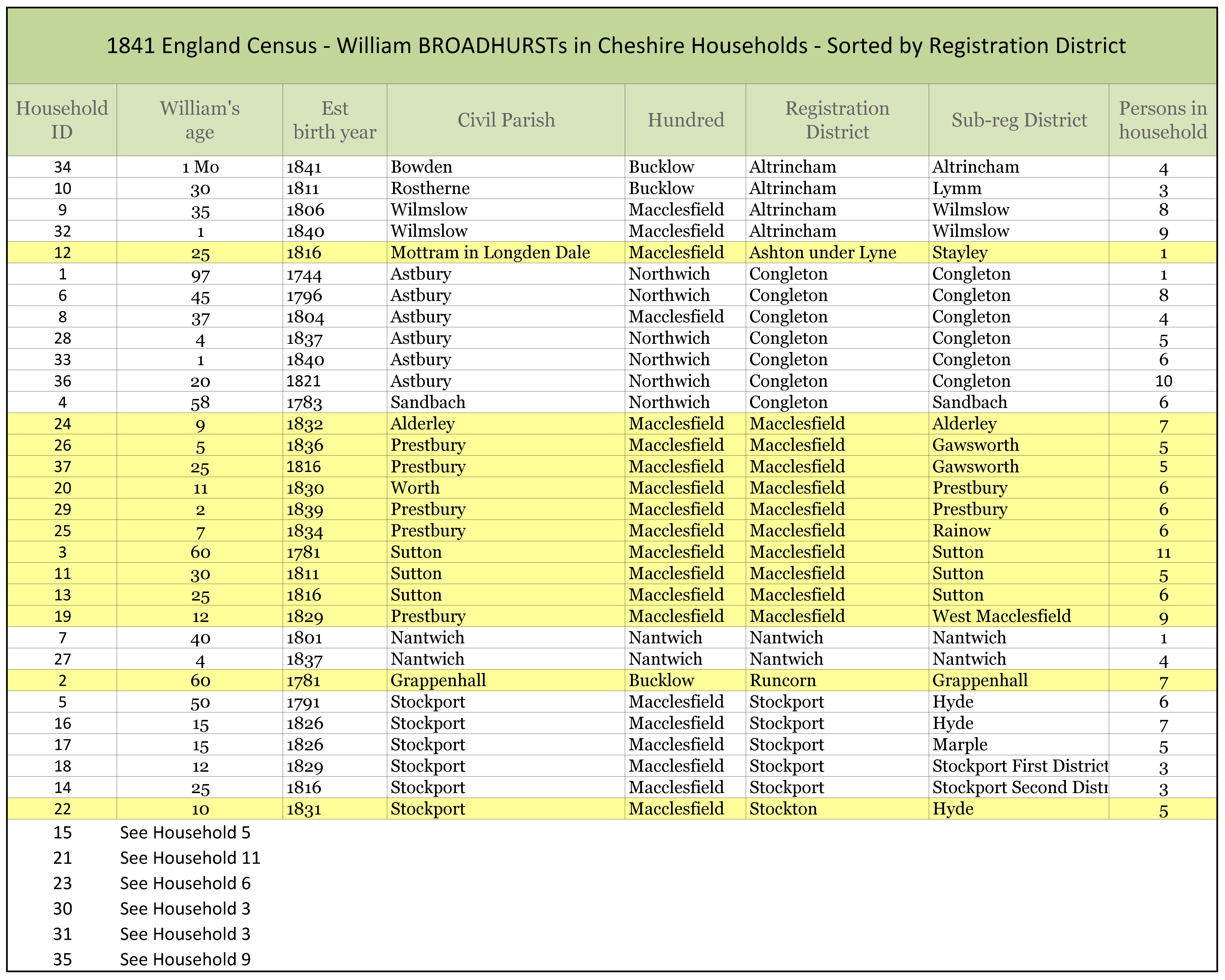 To help find William BROADHURST, the father of John BROADHURST, I compiled a list of all William BROADHURSTs living in Cheshire that were recorded in the 1841 England Census (Ancestry.com). In total 37 Williams were listed (to include “Wm”) in 31 different households. The household distribution by registration district is: Macclesfield 10, Congleton 7, Stockport 5, Altrincham 4, Nantwich 2 and Ashton under Lyne, Runcorn and Stockton all with 1 household each.