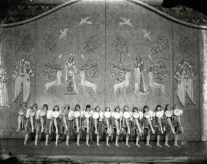Frances was born in 1908 in Dover, New Hampshire where her parents worked in a cotton mill and sometime after 1920, she moved to New York City. By opening night, 28 March 1927,  Frances was a dancing girl at the Majestic Theater (where the Phantom lives now) in a musical revue, “Rufus LeMaire’s Affairs.” In August of 1927 Frances was in the opening night cast of  “Ziegfeld Follies of 1927” at the New Amsterdam Theatre on 42nd Street, where Disney’s Lion King reigned. The picture above on the left is of the Ziegfeld Girls around the time Frances was a member. Additional information is listed in Frances’ Internet Broadway Database listing: click here to view.