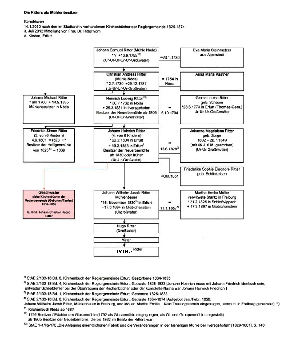 Nun einige Bemerkungen zur Ahnenreihe der Erfurter Ritter-Familie, wie sie uns bekannt ist, und die wir erst vor einigen Tagen mit Frau Dr. Ritter aktualisiert und ergänzt haben.