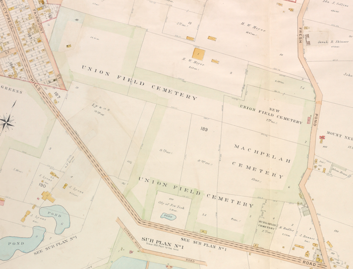 A 1913 map showing Machpelah and the Union Field cemeteries situated west of Fresh Pond Road (Cypress Hills Street) and north of Cypress Hills Road (Cypress Avenue)